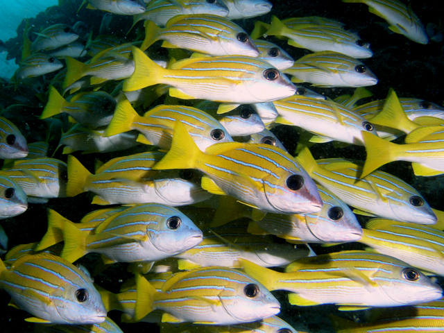 Sárga csattogóhalacskákOLYMPUS C8080WZ f 8 1/640 sec Fihalhohi house reef adott helyén mindig megtalálható sárga halacskái.