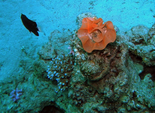 A kép az Eel Garden merülőhelyről kifelé sétálva készült: uszony a bal karon, maszk a nyakban, fotógép a jobb kézben, így hasaltam be a szédítő másfél méteres vízbe, amikor észrevettük ezt a kövek közül kikandikáló - amúgy bőven kölökkorban lévő - maszkos murénát. | ||