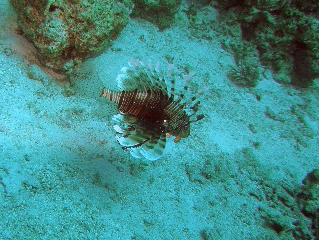 A kép az Eel Garden merülőhelyről kifelé sétálva készült: uszony a bal karon, maszk a nyakban, fotógép a jobb kézben, így hasaltam be a szédítő másfél méteres vízbe, amikor észrevettük ezt a kövek közül kikandikáló - amúgy bőven kölökkorban lévő - maszkos murénát. | ||