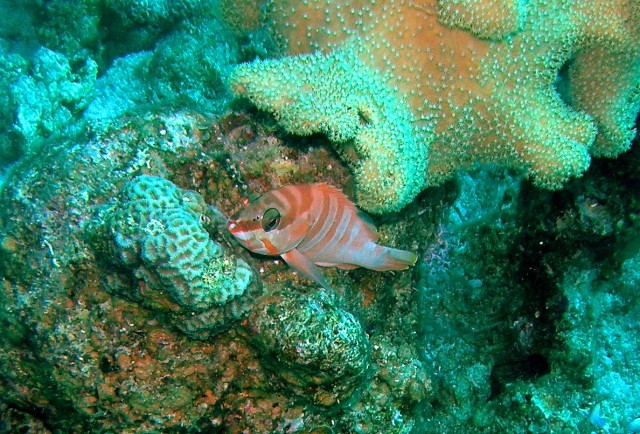A kép az Eel Garden merülőhelyről kifelé sétálva készült: uszony a bal karon, maszk a nyakban, fotógép a jobb kézben, így hasaltam be a szédítő másfél méteres vízbe, amikor észrevettük ezt a kövek közül kikandikáló - amúgy bőven kölökkorban lévő - maszkos murénát. | ||