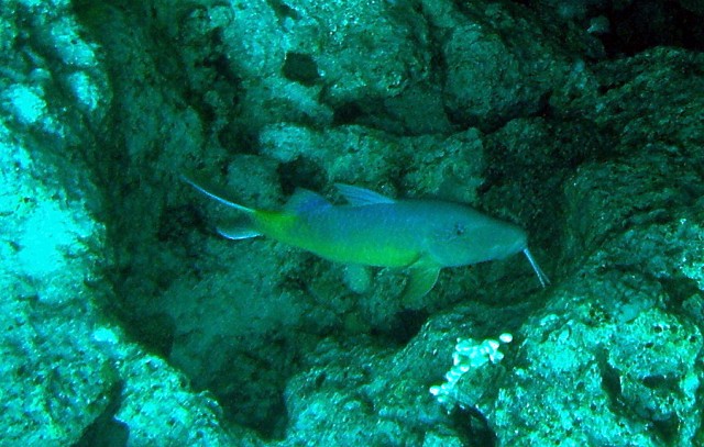 A kép az Eel Garden merülőhelyről kifelé sétálva készült: uszony a bal karon, maszk a nyakban, fotógép a jobb kézben, így hasaltam be a szédítő másfél méteres vízbe, amikor észrevettük ezt a kövek közül kikandikáló - amúgy bőven kölökkorban lévő - maszkos murénát. | ||