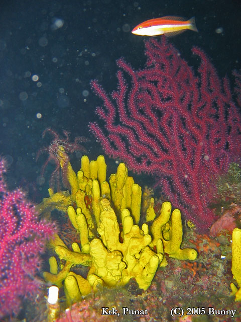 Szivacs és gorgóniaCanon PowerShot A60 f 2.8 1/400 sec A sárga szivacson egy liliom csücsül (nevével ellentétben ez egy állat), mellette gorgóniák.
