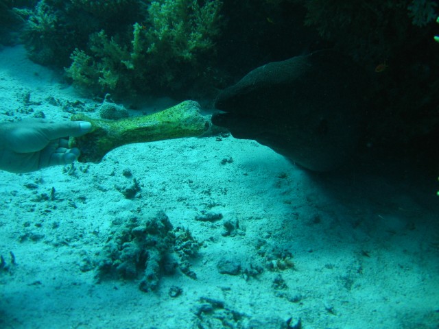 Canon PowerShot A520 f 2.6 1/320 sec Etetés egy murénánál marhalábszár csonttal. Nem ízlett neki:( A csontot pár méterre a murénától találtuk...