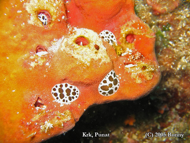Családi szivacsCanon PowerShot A60 f 2.8 1/320 sec A sötét pettyes fehér párducfoltos csigák és házukul szolgáló szivacs.
