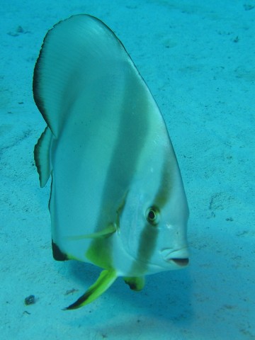 Canon PowerShot A520 f 3.2 1/400 sec Sataya, Dolphin Reef. Egy aranyos batfish szegődött mellénk, percekig úszott velünk a sekélyben. Itt már beúsztunk a lagúnába, ahol 3-5 méteren kolbászoltunk. Ja, egy brutál barracuda is felbukkant a végén...