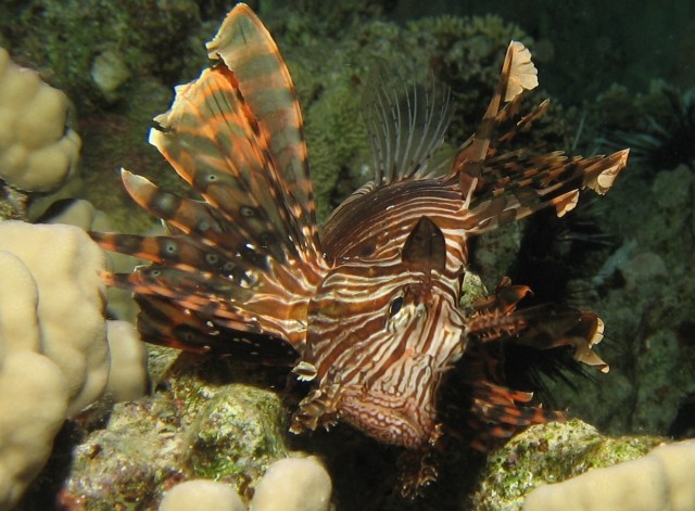 Canon PowerShot A520 f 2.6 1/400 sec Abu Dabbab. Éjszaka. Az egyik koralltornyon kb. 9 tűzhal kavart kis területen. Belőlük sok volt. Éjszaka segítettünk nekik vadászni lámpáink fényével. Irtó gyorsak, ha zabálásról van szó...