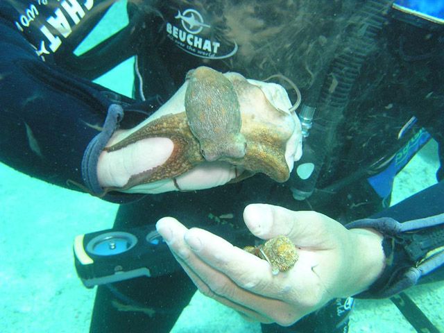 PolipAz apró lábasfejű a divemaster kezén keresett menedéket.