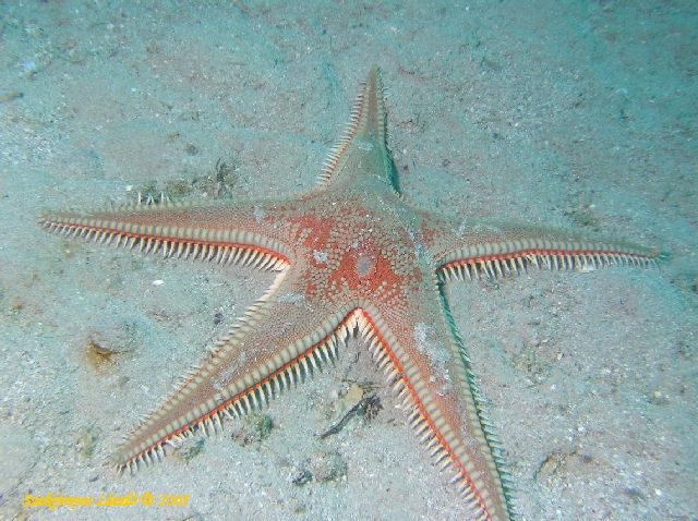 Narancsszínű tengeri csillagDe hívhatnánk fürgének is. A hasán levő sörtékkel nagyon gyorsan tud mászni. Ez viszont éppen aludt vagy emésztett vagy valami olyat csinált amihez nem sok mászkálás kell.