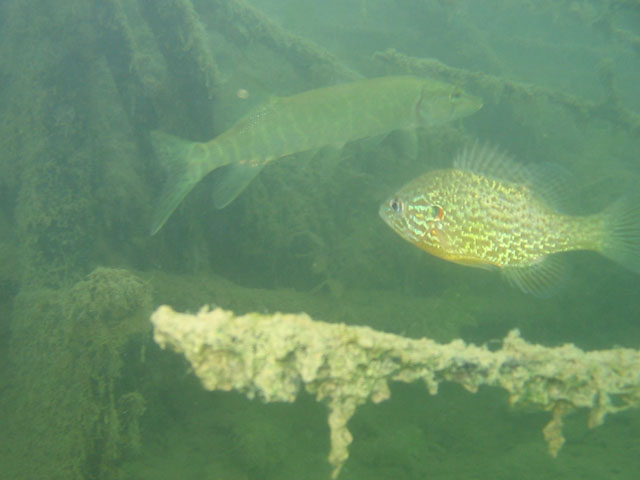Csuka és naphalCanon PowerShot A60 f 2.8 1/60 sec Háttérben egy méretes csuka a fa gyökerei felett lebegve, előtérben - szerintem ez a naphal -.