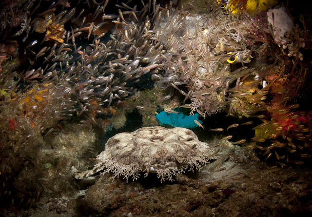 Egy jó szőnyeg(cápa) igazán feldobja a lakástNikon NIKON D300S f/16 1/200 sec Mantás merülésre tartottunk, csak éppen a mantáknak nem volt meghívója az eseményre. Amely így meglehetősen okafogyottá sikeredett volna, ha nincs a hatalmas áramlásban egy kis zátony alatt ez az üreg, amelyben egy Wobbegong - szőnyegcápa ütött tanyát. Körülötte ezernyi üeghal sürgött-forgott. Elhagyni az üreget nem tudták volna, akkora volt az áramlás.