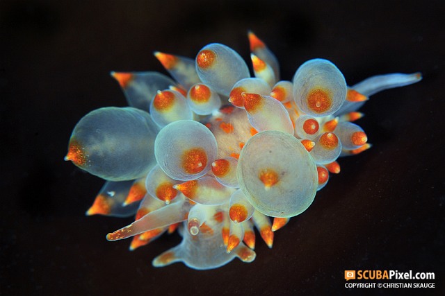 Eubranchus farraniFeltűnő jelenség ez a kis csiga lufiszerű kinövéseivel.