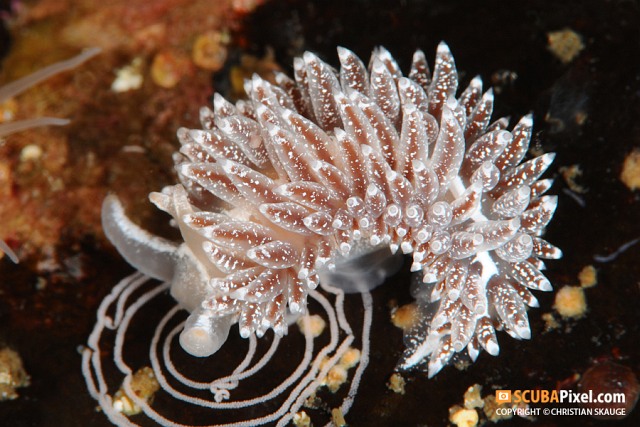 Flabellina lineataPetéivel együtt látható ez a csiga. Több változatukat figyelték meg, lehet, hogy önálló, új fajba tartozik némelyik.
