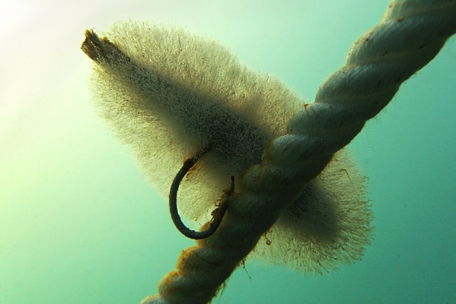 Keresztre feszítve...Canon PowerShot G9 f/3.5 1/80 sec A horgász "kötélbe szakította" kishalas szerelékét. A halacska még sokáig szenvedett, végül elpusztult. A hűvös vízben lassan belepte a penész...