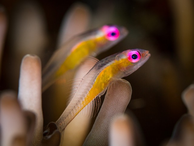 Pink eyesf/13.0 1/180 Small gobies are sitting on a little horn coral. Tulamben, Bali, Indonesia