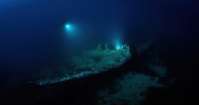 Dark Secret of the Adriaticf/9.0 1/250 Diver exploring the wreck of an aircraft that turned out to be one of the very few remaining pieces of the bomber plane that was once feared throughout Europe: the legendary Stuka, the Junkers JU-87. Only 3 intact pieces survived the centuries, they are on show in museums. Some wrecks are known, but this one, near Zirje in Croatia is one of the most fully survived ones.