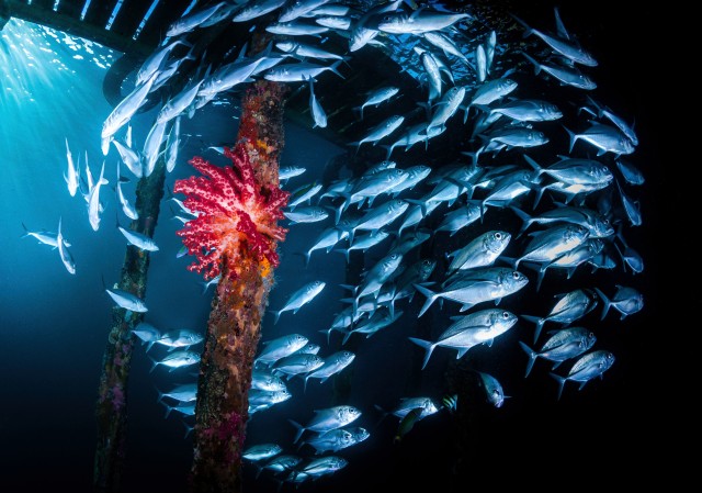Under the pierf/11.0 1/200 A soft coral thrives under a jetty at Raja Ampat, with jackfish circling around.