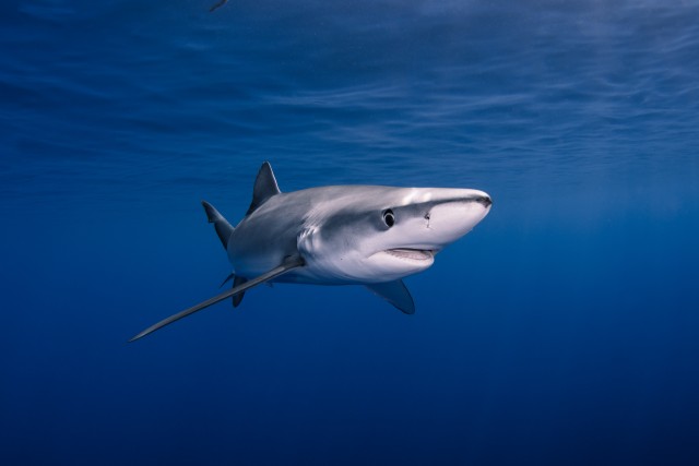 Blue Shark - Azores, Portugalf/5.6 1/160 A curious blue shark gracefully passing by in the exceptionally clear and blue waters off the Azores, on a sunny September day. I like this photo, as it emphasises the torpedo-like shape of this species.