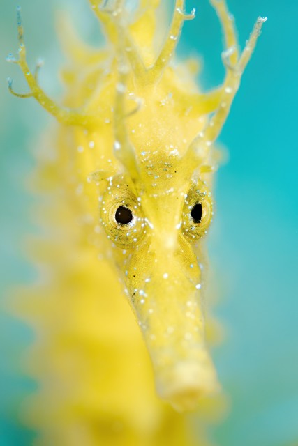 Yellow dragonf/5.6 1/100 Portrait of a Yellow long-snouted seahorse (Hippocampus ramulosus) taken in very shallow water (5m underwater) just by the shore at Razanj, The Adriatic, Croatia.