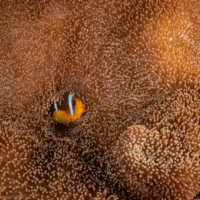 Alonef/13.0 1/160 Clownfishes are living in this huge anemone, and once I had luck to see only one´s face on the right spot.