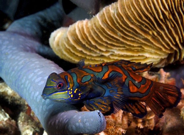 MandarinhalNIKON D200 f 16 8/1000 sec Az aprócska, újjnyi nagyságú mandarinhalak talán a legszínesebb halak a víz alatti világban. A Nyugat-Indo-Pacifikus térségben élnek. Nem könnyű őket fotózni, hiszen csak alkonyatkor, vagy derengő holdfényben bujnak elő a korallbozót mélyéről (amit leárnyékolt búvárlámpával próbálunk utánozni), mert partnereket keresnek a nászfelúszáshoz. Nászfelúszást szépen elkapni nagy kihívás a búvárfotósok számára. Már az is öröm, ha egy jó portréfelvétel sikerül.